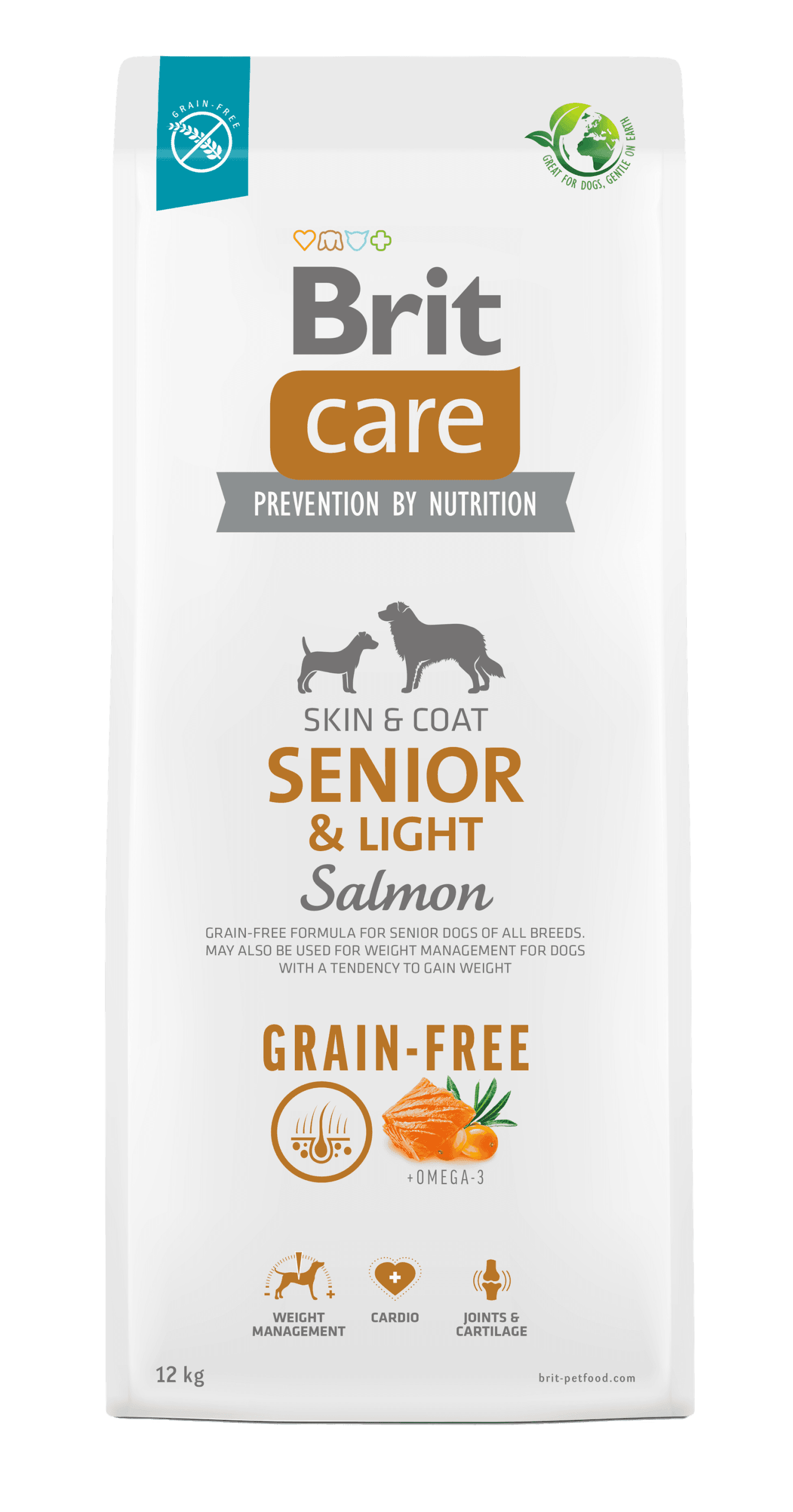 Brit Care Dry Dog Food Grain-free Formula Salmon & Potatoes for Senior Dogs of All Breeds (over 7 Years of Age). Also suitable for dogs with a tendency to put on weight. Complete dog food.