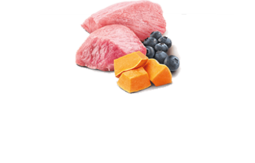 lamb leg (40%), chicken fillet, herring, pumpkin (5%), sweet potato, boiled chicken eggs, blueberry (4%), fish oil, animal fat, fructo-oligosaccharides, chondroitin sulphate, glucosamine, vitamins, minerals.
