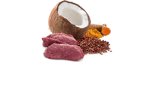 venison shank (65%), quinoa seed extracted (5%), fish oil, coconut (4%), fructo-oligosaccharides, chondroitin sulphate, glucosamine, vitamins, minerals. Protein sources: venison shank. Carbohydrate sources: quinoa seed extracted.
