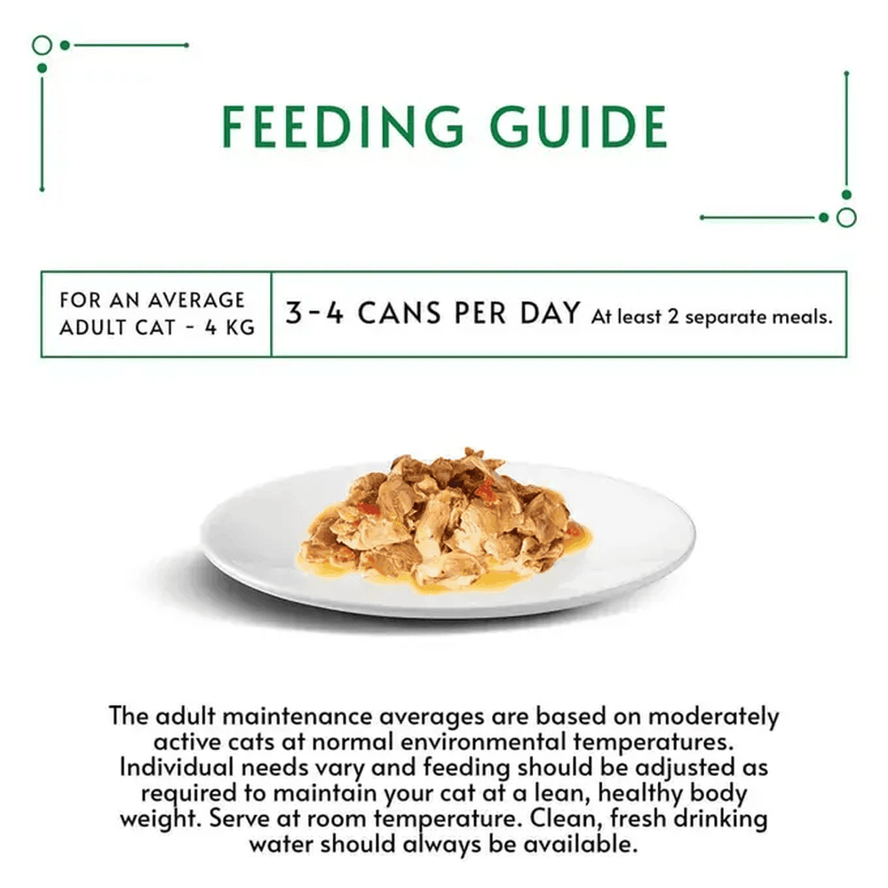 For an average cat of 4 kg, feed 2 to 3 cans per day in at least 2 separate meals. The adult maintenance averages are based on moderately active cats at normal environmental temperatures. Individual needs vary and feeding should be adjusted as required to maintain your cat at a lean, healthy body weight.