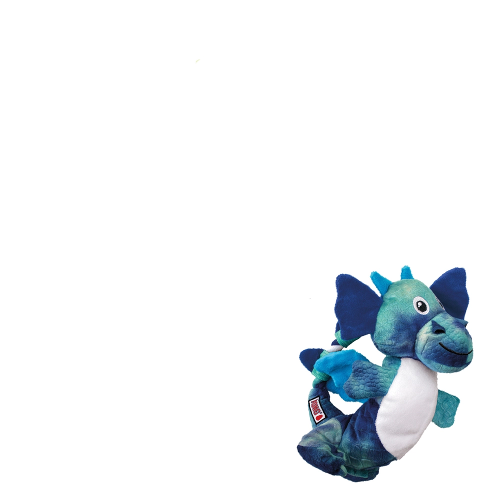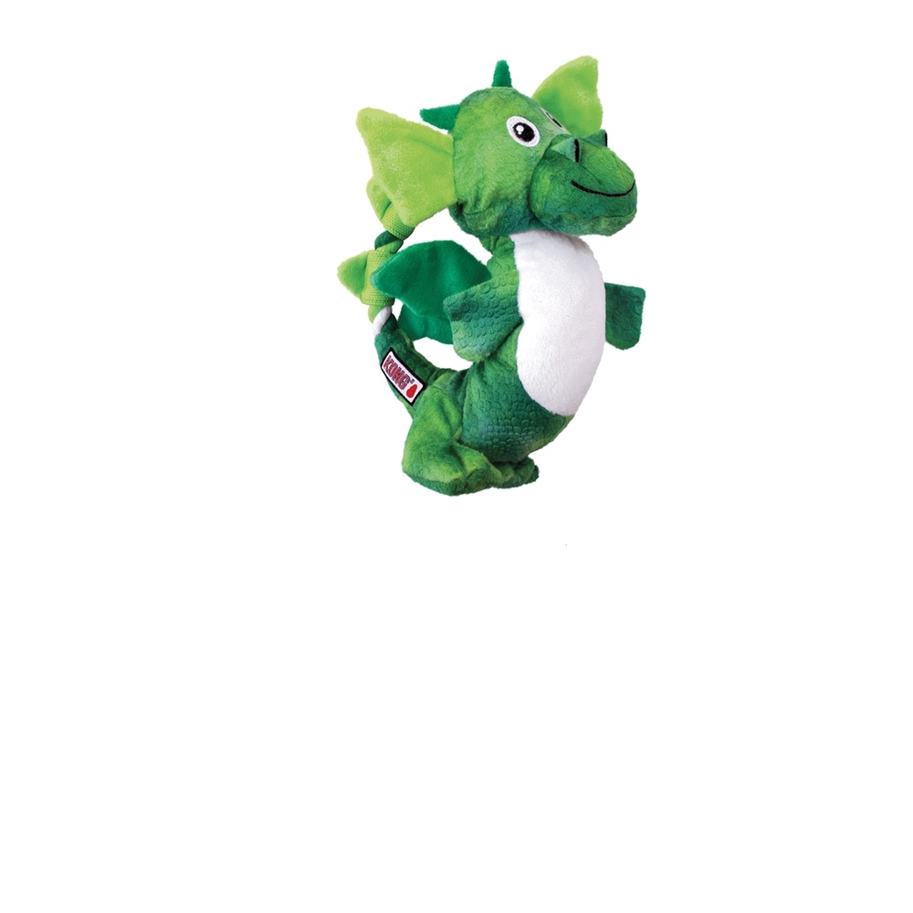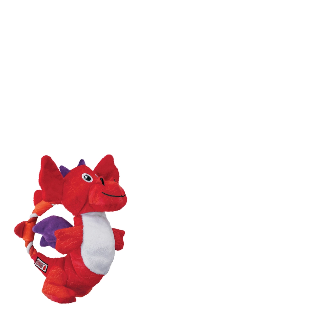 The KONG Dragon Knots is a plush dragon toy with an internal knotted rope and minimal stuffing for tugging, shaking and gentle chewing.