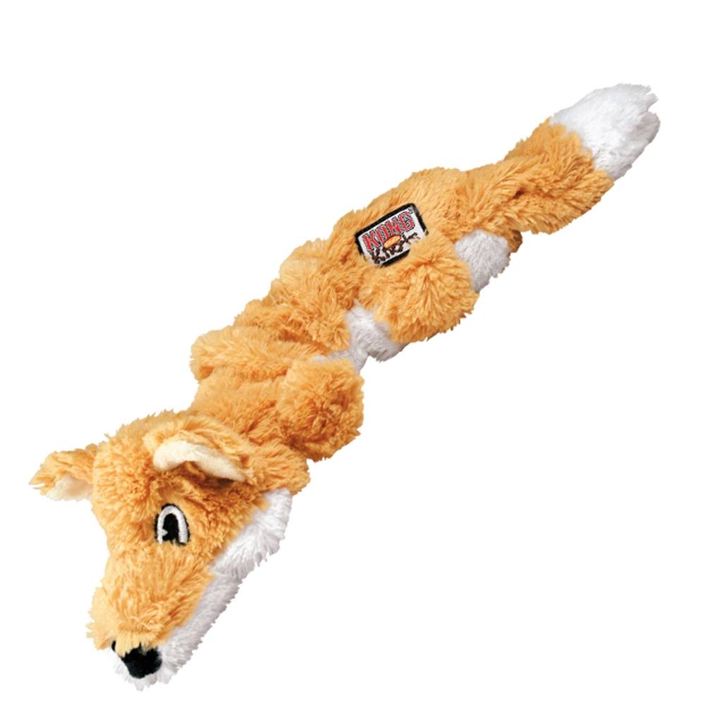 The KONG Scrunch Knots Fox combines soft plush fur with a durable internal knotted rope to satisfy natural chewing instincts. The stretchy scrunch fabric moves as dogs tug and chew, offering a playful texture that keeps them engaged. A built-in squeaker adds extra excitement, creating a fun balance between durability and softness during indoor play.