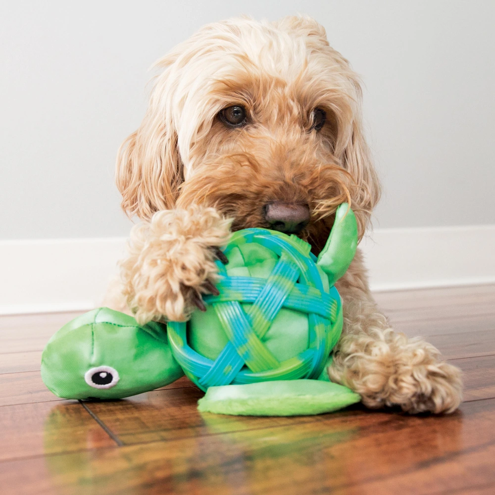 The KONG Shells Turtle offers multiple textures that encourage dogs to explore through chewing and gentle play. The rubber shell promotes lasting engagement while the plush body and squeaker stimulate affectionate indoor interaction.