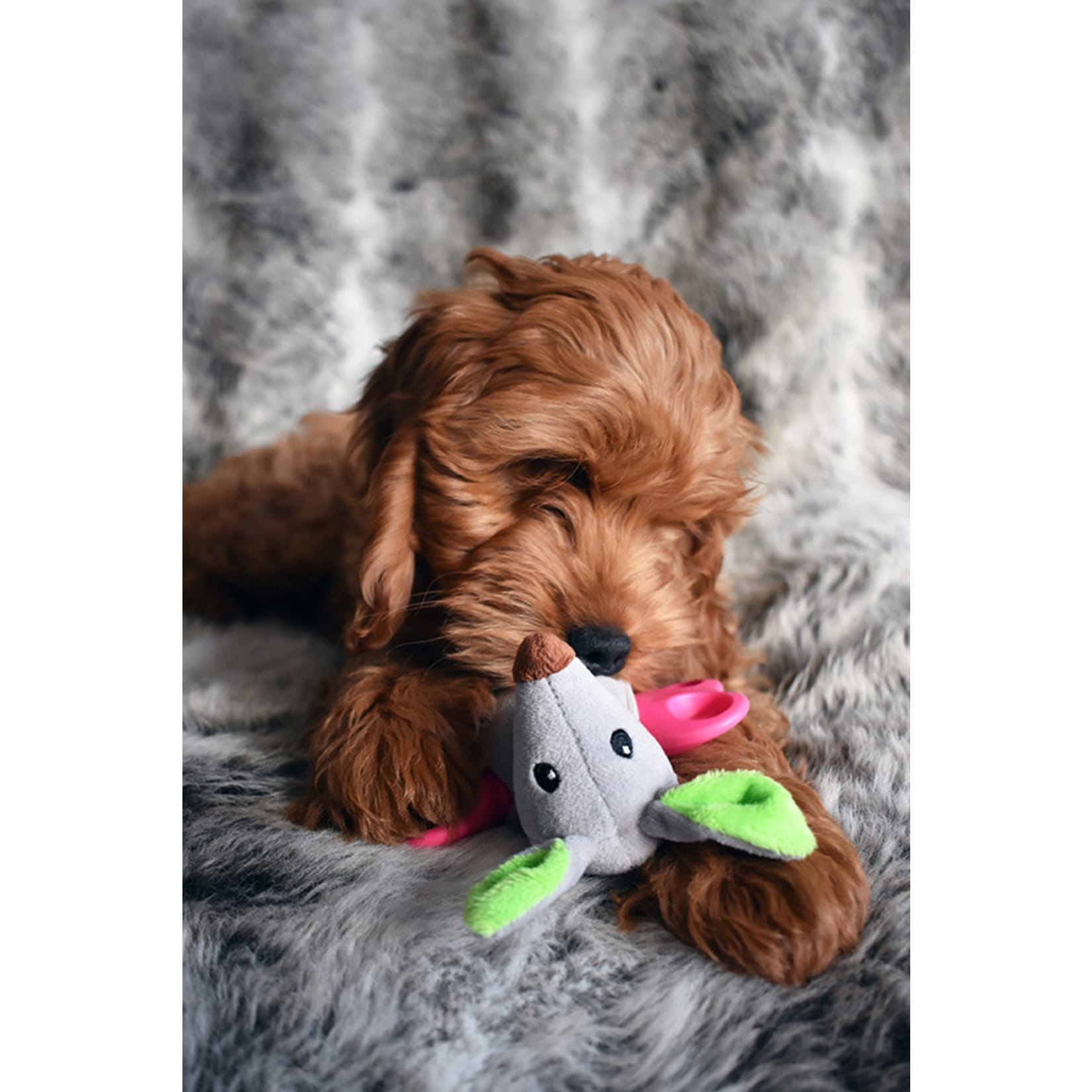 Multi textures – plush & rubber, for added interest with a hidden squeaker for extra playtime fun. With a treat pocket and a tough rubber bone through the toy for teething puppies.