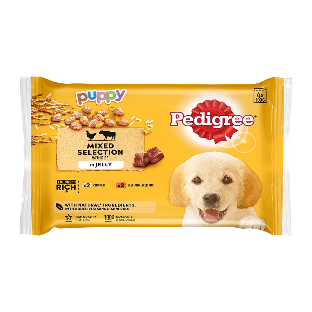 Our PEDIGREE® Junior puppy dog food wet mixed chunks in jelly pouches are complete and balanced with prebiotics. With balanced levels of calcium and phosphorus for Healthy Growth and Made with ingredients sourced with care. No added artificial flavours, artificial colours or artificial preservatives.- Made with carefully sourced ingredients