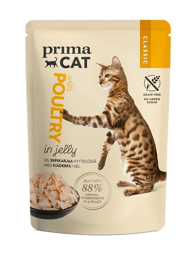 PrimaCat Poultry in Jelly pouches are an easy way to offer your cat a daily serving of delicious, tasty complete food. The product contains half delicious jelly, half succulent poultry flavored fillets. The meat strips are 88% meat and animal-based raw material. In addition, our recipe is sugar- and grain-free, which makes it unique among the complete foods on the supermarket´s cat food shelf.