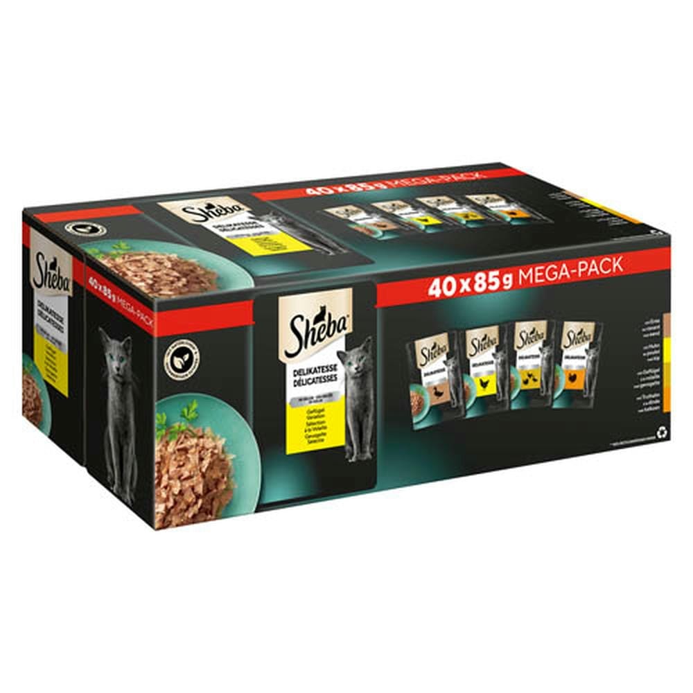 Wet cat food with a generous serving of mouth-watering extra sauce. A brilliant weekday alternative that your cat will love. Available in 85g convenient cat food pouches.Cat food in succulent gravy made with natural* and high quality ingredients.High quality SHEBA® wet cat food. 100% complete and balanced everyday meal for your feline companionCat food trays with no added artificial colourants or preservatives.Adult cat food with a delicious variety of cod, salmon, tuna and whitefish with extra sauce.Wet cat food pouches served in a convenient pouch; squeeze for the ultimate clean and elegant serve.Cat food developed with our nutritionist from Waltham Petcare Science Institute.INGREDIENTS