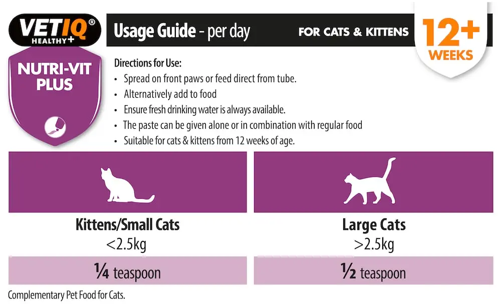VETIQ® Nutri-Vit Plus is a high calorie, tasty and nutritional supplement providing a range of essential vitamins and minerals for your cat or kitten. These nutrients work together as an aid in maintaining your pet’s overall health, providing extra energy and nutrition in an easily digestible paste.