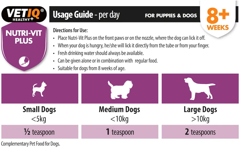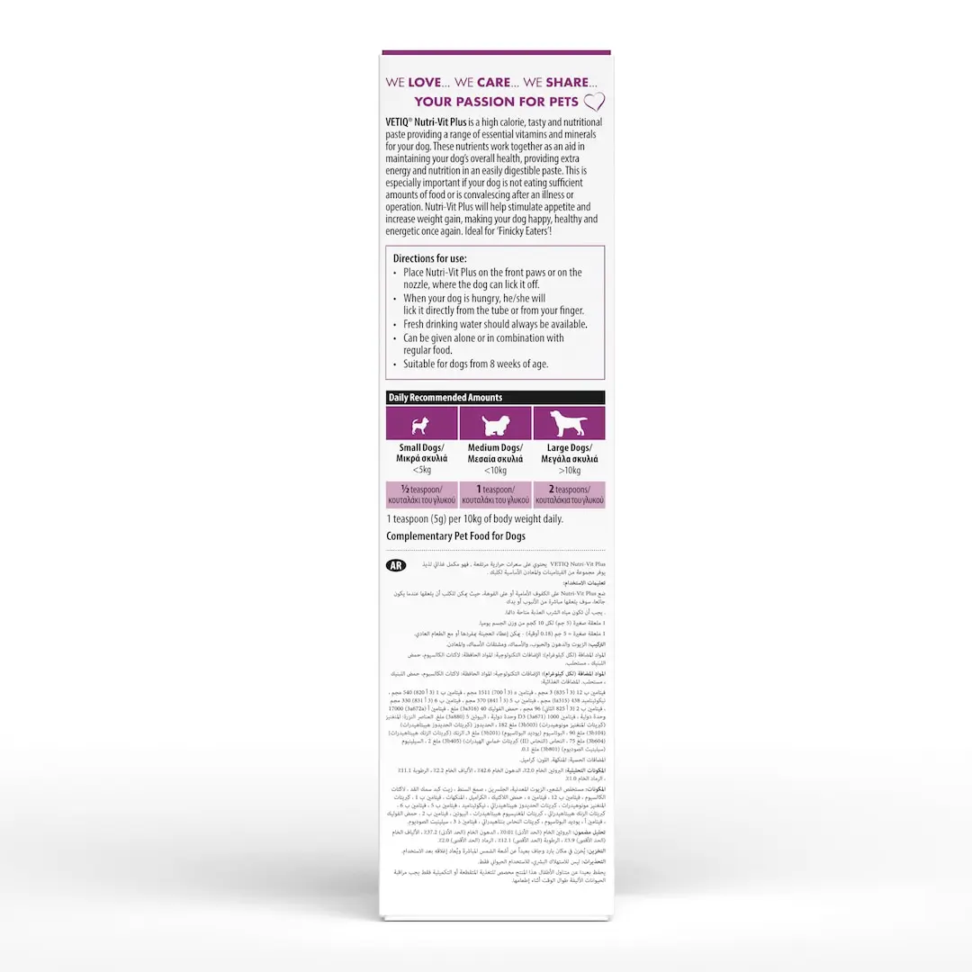 VETIQ® Nutri Vit Plus For Dogs is a high calorie, tasty and nutritional supplement providing a range of essential vitamins and minerals for your dog. These nutrients work together as an aid in maintaining your pet’s overall health, providing extra energy and nutrition in an easily digestible paste.