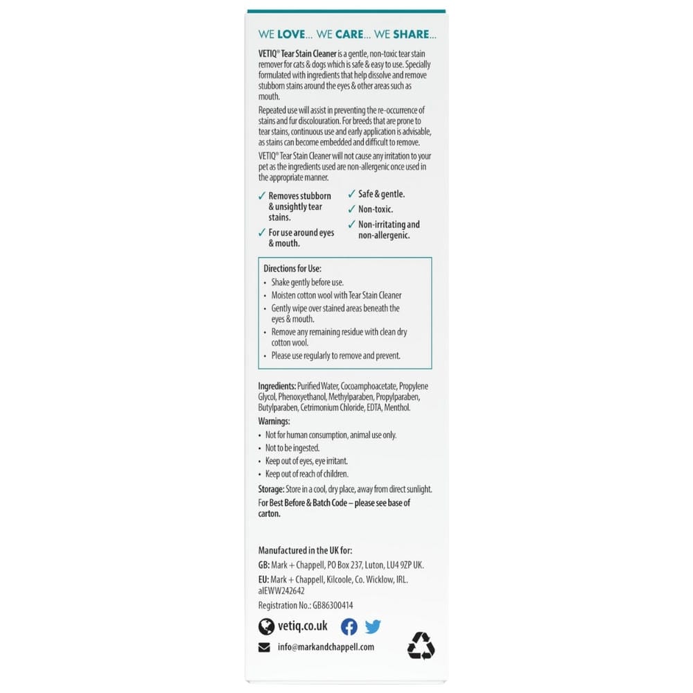VETIQ® Tear Stain Cleaner is a gentle, non-toxic tear stain remover for cats and dogs, which is safe and easy to use. Specially formulated with ingredients that help dissolve and remove stubborn stains around the eye and other areas such as mouth.
