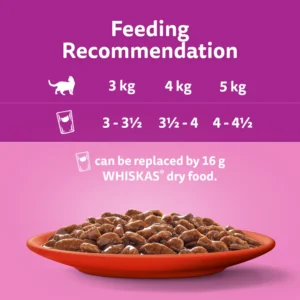 WHISKAS® 1+ Meaty Meals adult cat food pouches in gravy are specially prepared to preserve the natural goodness and deliciousness of high quality ingredients and will see your cat rush to the bowl faster than ever before! Made with sustainably sourced ingredients, these cat food pouches contain everything your cat needs to keep them happy and healthy.Each delicious wet cat food recipe is made with 100% high quality ingredients and is formulated to provide 100% of your 1+ cat’s daily needs.Cat food pouches with high quality protein to support strong muscles.Adult cat food formulated with Vitamin C to help support natural defences.Cat food containing zinc, essential for a healthy skin & coat.We are committed to reducing our environmental impact. 85% of our factories in Europe use renewable electricity and we’re working to move to 100% by 2025.Ingredients