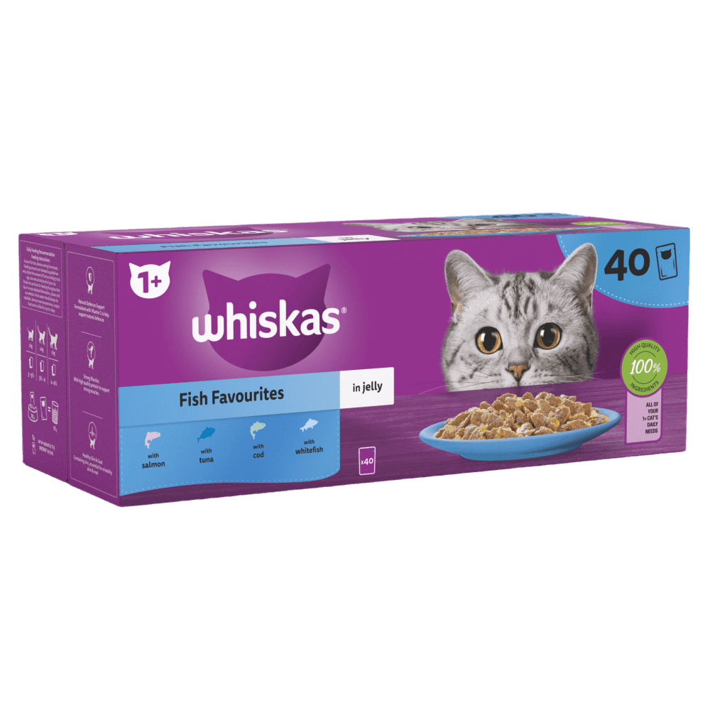WHISKAS® 1+ Fish Favourites adult cat food pouches in jelly are specially prepared to preserve the natural goodness and deliciousness of high quality ingredients and will see your cat rush to the bowl faster than ever before! Made with sustainably sourced ingredients, these cat food pouches contain everything your cat needs to keep them happy and healthy.Cat food containing zinc, essential for a healthy skin & coat.Cat food pouches with high quality protein to support strong muscles.Adult cat food formulated with Vitamin C to help support natural defences.Each delicious wet cat food recipe is made with 100% high quality ingredients and is formulated to provide 100% of your 1+ cat’s daily needs.We are committed to reducing our environmental impact. Fish in our wet cat food recipes is sustainably sourced.Ingredients